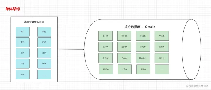 早些年我司新开一条业务线切入金融领域,最开始的因为担心风险过大,所以并未投入太多的成本,处于一个试错阶段,最初就把所有业务都怼入一个war包,所有业务共享一个库资源,结构大致如下: