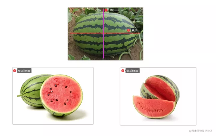 现在你的手里有一个西瓜,吃的时候切法有两种,一种是以垂直方向竖切,另一种是以水平方向横切,如下: