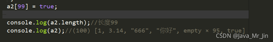 在JS中数组的长度可以随意改变,随意定长度。如果定义一个 数组下标 a2[99] = true;得出结果就是长度是100,中的没有赋值的为empty x 95,都为undefined, 第100个为true 如图:
