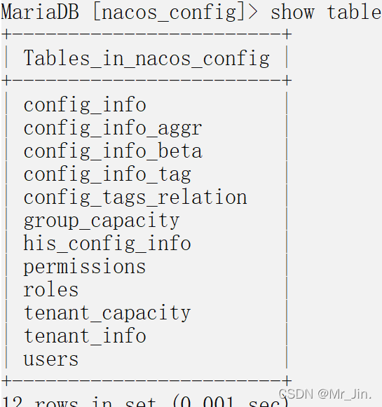 成功后会创建一个nacos_config数据库,打开数据库会看到一些表,例如: