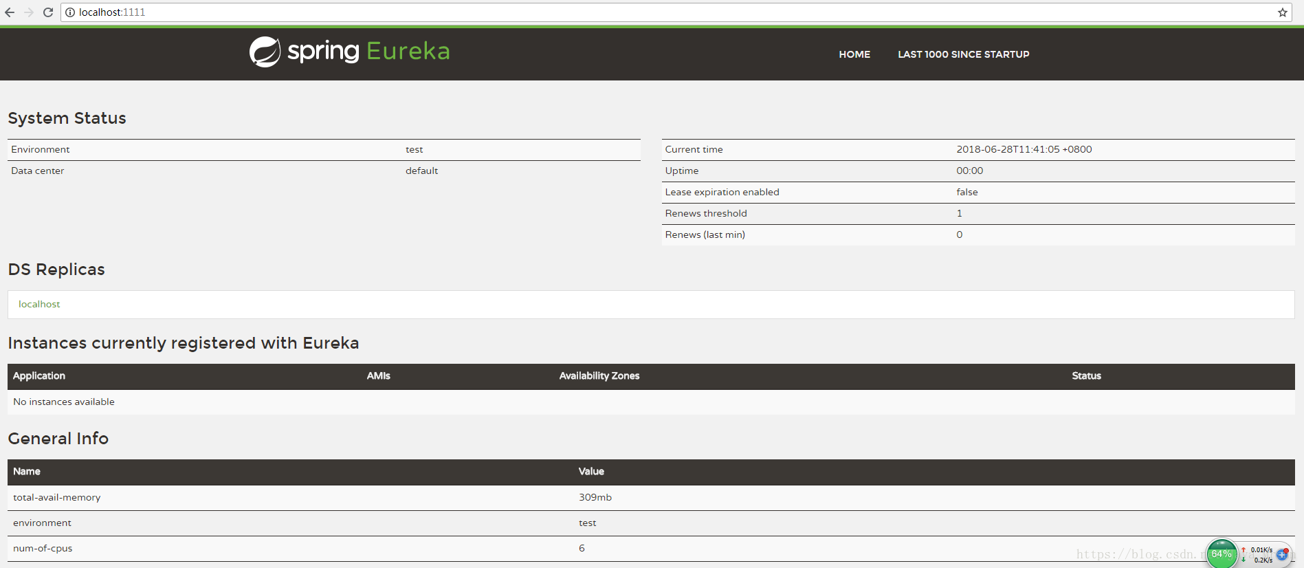 这样我们的注册中心就好了,启动工程访问:http://localhost:1111/可以看到如下画面没有任何服务