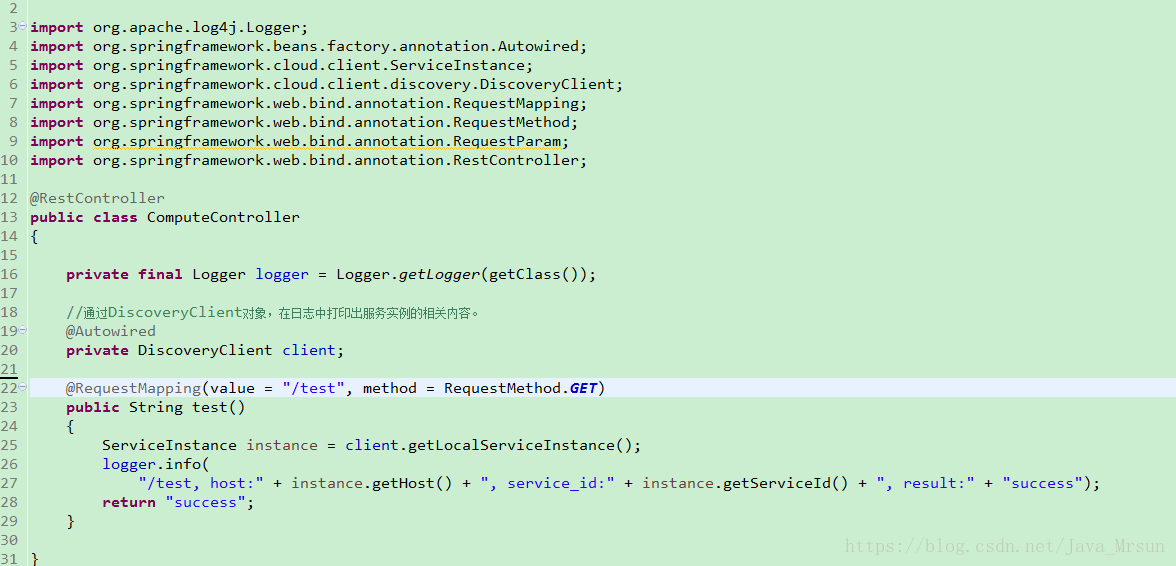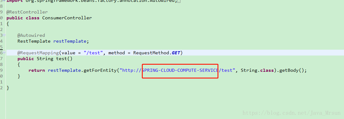 3.创建ConsumerController来消费SPRING-CLOUD-COMPUTE-SERVICE的test服务。