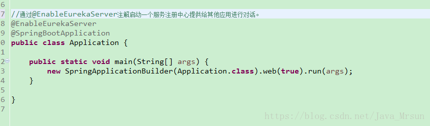 2.启动方法加上@EnableEurekaServer注解启动一个服务注册中心提供给其他应用进行对话