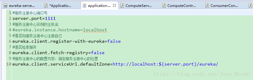 3.在默认设置下,该服务注册中心也会将自己作为客户端来尝试注册它自己,所以我们需要禁用它的客户端注册行为,只需要在application.properties中配置: