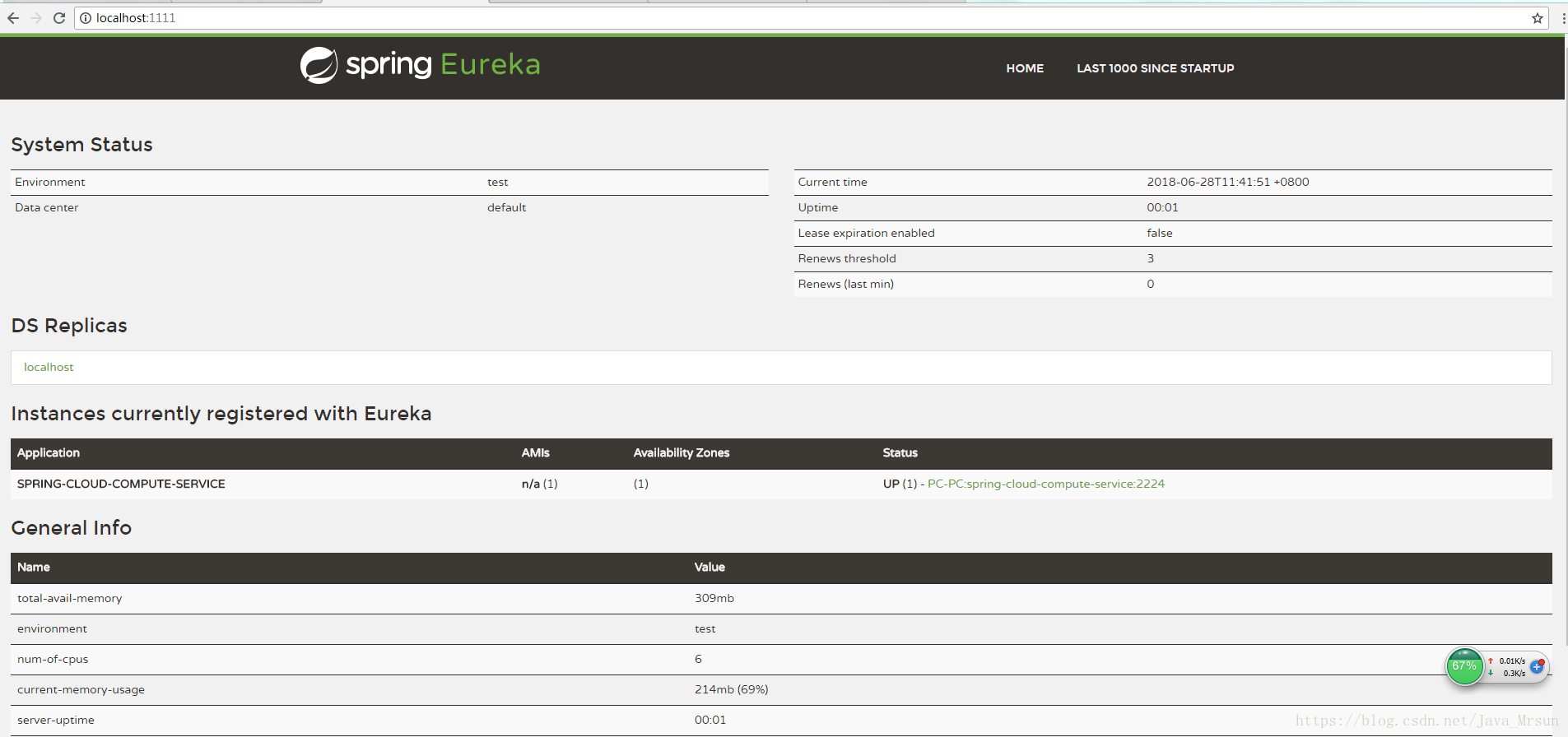 启动该工程后,再次访问:http://localhost:1111/,就可以看到我们定义的服务被注册了名称为SPRING-CLOUD-COMPUTE-SERVICE