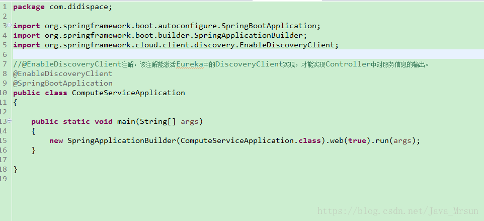 3.启动类加上@EnableDiscoveryClient注解,该注解能激活Eureka中的DiscoveryClient实现,才能实现Controller中对服务信息的输出。
