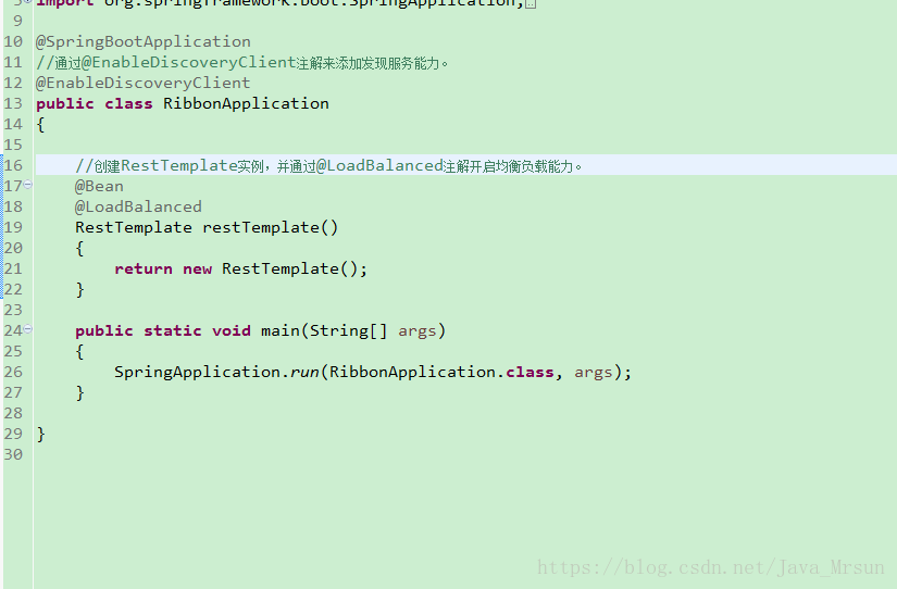 通过@EnableDiscoveryClient注解来添加发现服务能力。创建RestTemplate实例,并通过@LoadBalanced注解开启均衡负载能力。