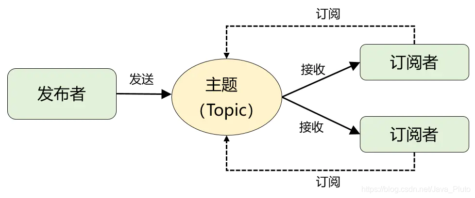 在发布-订阅模型中,存放消息的容器变成了 “主题”,订阅者在接收消息之前需要先 “订阅主题”。最终,每个订阅者都可以收到同一个主题的全量消息。