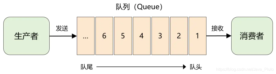 2、队列:大家应该再熟悉不过了,是一种先进先出数据结构。它是存放消息的容器,消息从队尾入队,从队头出队,入队即发消息的过程,出队即收消息的过程。