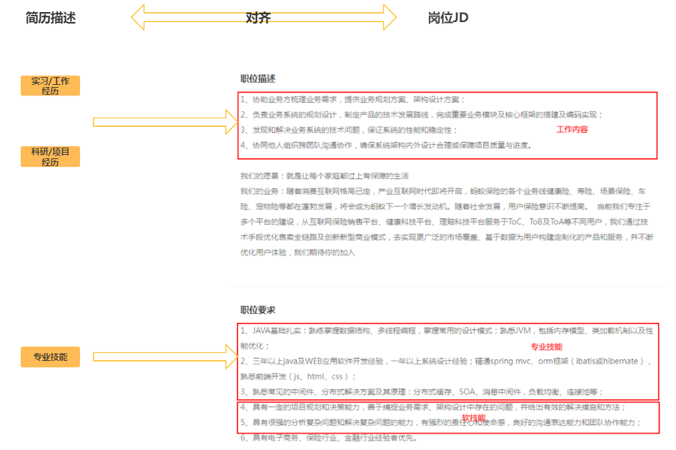 搞清楚了面试官想要什么样的人,我们在编写简历的时候尽量往这些要求上面去靠拢。实际上在岗位JD中,已经描述了对于找人的要求,因此我们在准备简历的时候,工作经历、项目经历以及专业技能要尽量对齐岗位JD中的描述。