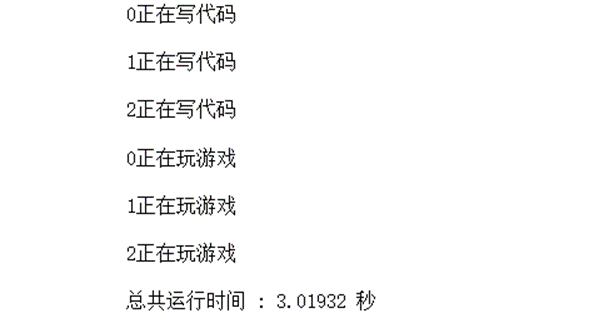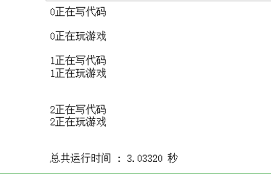 import time``# 定义第一个``def coding(): for x in range(3): print('%s正在写代码\n' % x) time.sleep(1)``# 定义第二个``def playing(): start = time.time() for x in range(3): print('%s正在玩游戏\n' % x) time.sleep(1) end = time.time() running_time = end - start print('总共运行时间 : %.5f 秒' % running_time)``def single_thread(): coding() playing()``# 执行``if __name__ == '__main__': single_thread() # 执行单线程