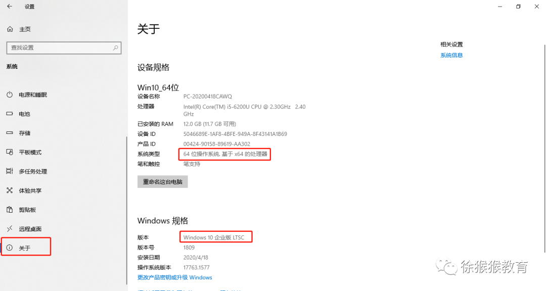 3. 点击「关于」查看「版本型号和操作系统位数」**,如图所示,该设备为Windows10/64位操作系统。