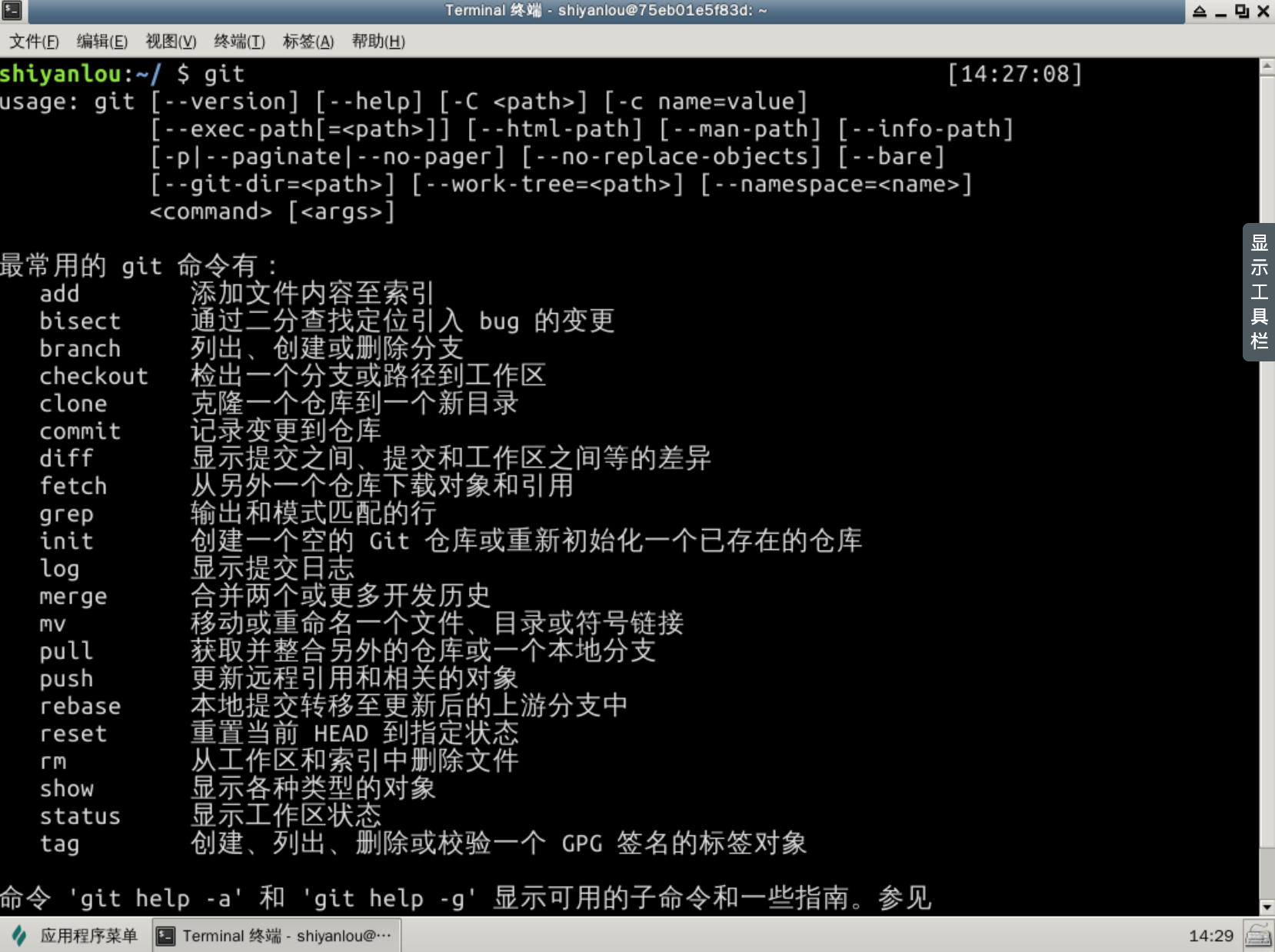 由于环境中预装了 Git,打开 终端 ,输入 git 可以检测是否安装成功: