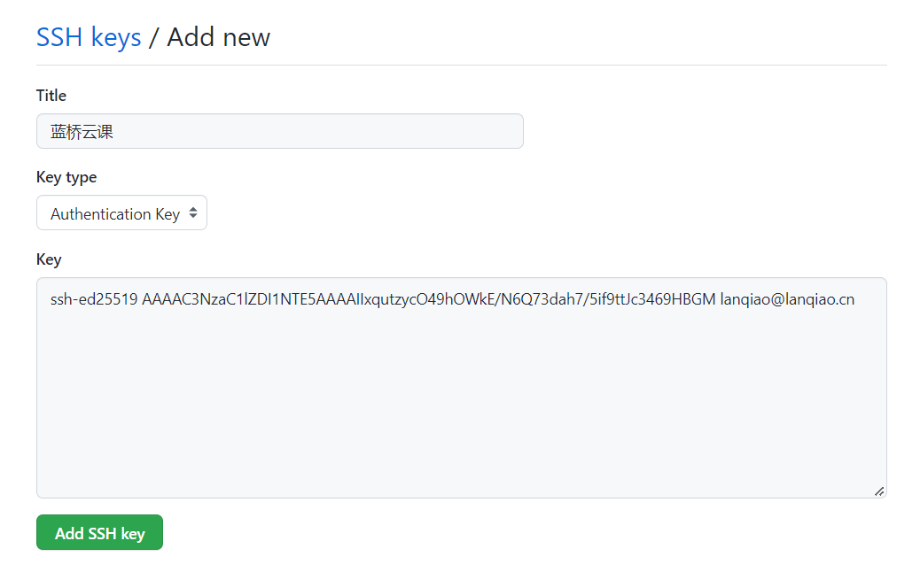 Title 自定义,把剪切板中的内容粘贴到 Key 中,点击绿色按钮添加 SSH Key 即可: