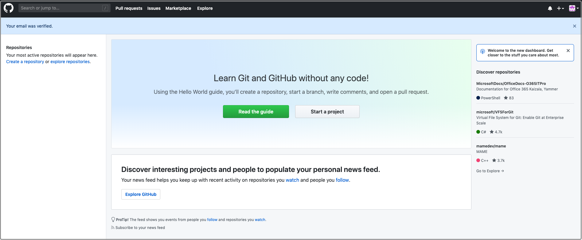 最后,去注册邮箱中接收验证邮件,验证后,自动用新注册账户登录,进入 GitHub 主页。