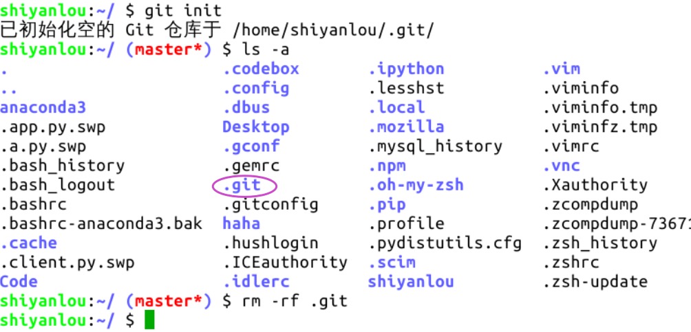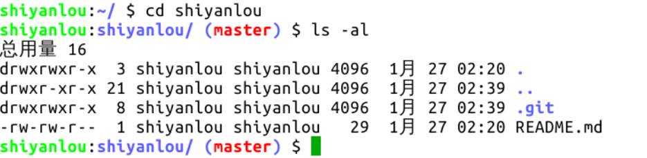 进入仓库主目录,如下图所示,仓库主目录中有个 .git 隐藏目录,它里面包含了仓库的全部信息,删掉这个目录,仓库就变成普通的目录了。进入到仓库目录中,命令行前缀发生了一些变化,出现了红色的 master ,它就是当前所在的分支名: