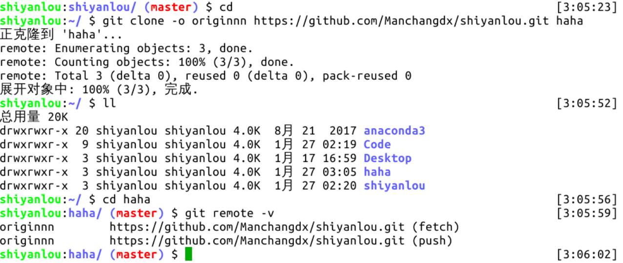 克隆远程仓库到本地时,还可以使用 -o 选项修改主机名,在地址后面加上一个字段作为本地仓库的主目录名,举例如下: