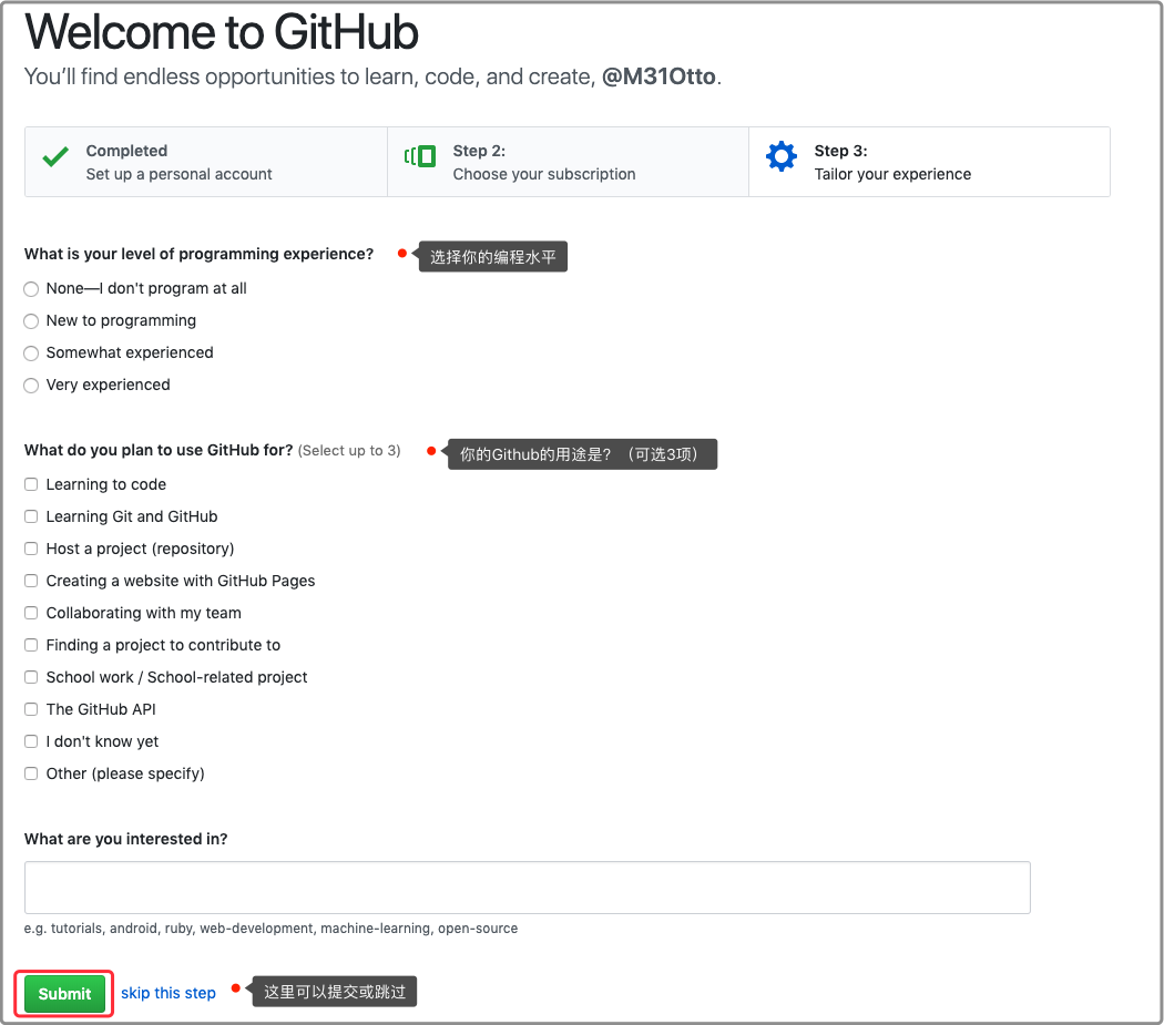 下一步,回答两个问题,也可以在最下面选择跳过: