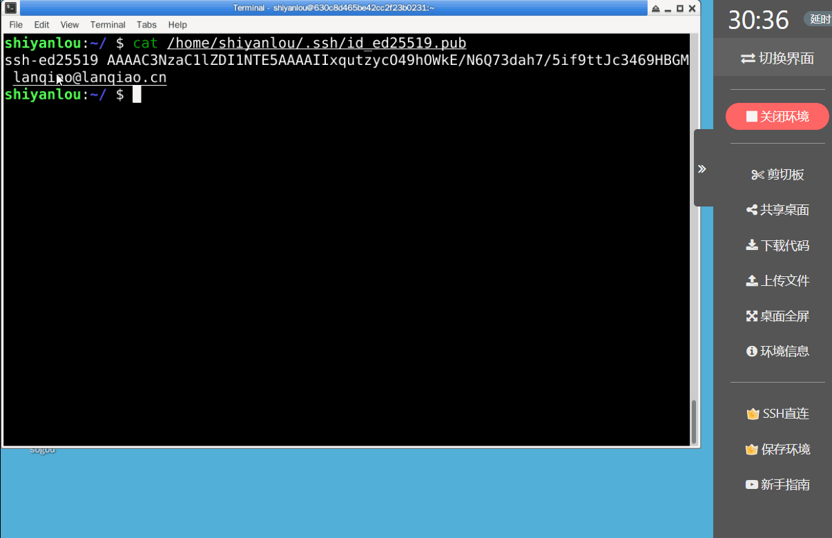 将 ~/.ssh/id_ed25519.pub 文件中的公钥内容复制出来,实验环境中可以使用右侧工具栏中的剪切板复制: