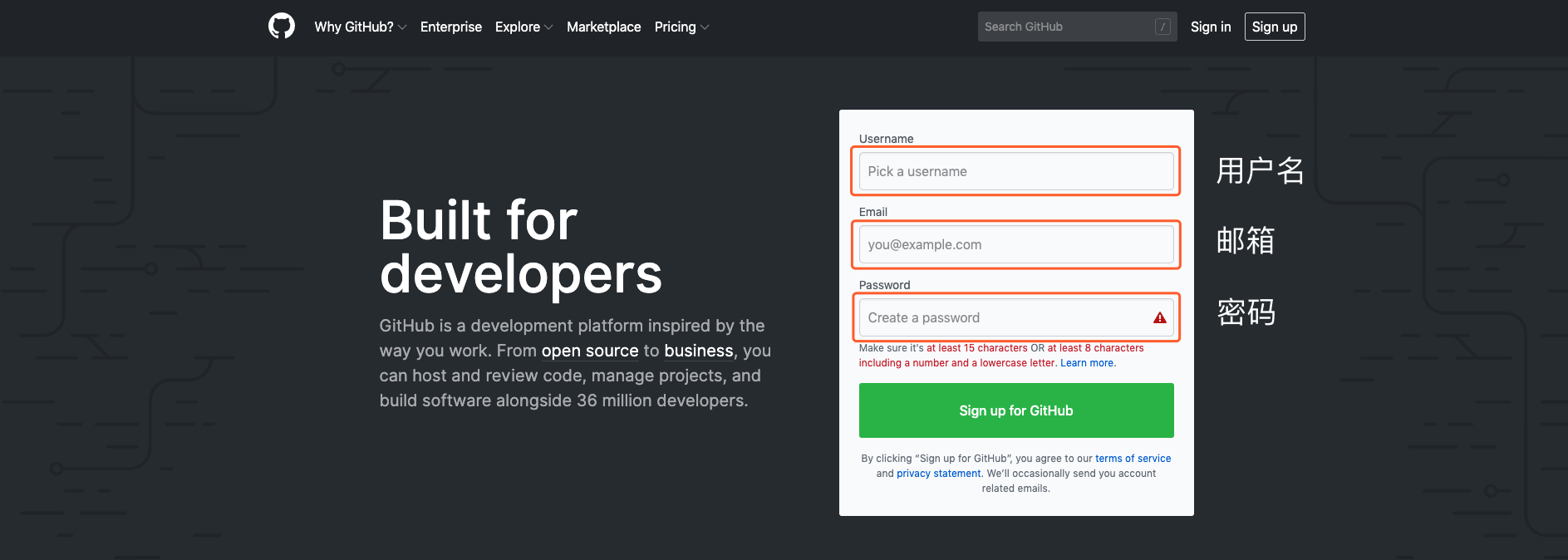 打开 GitHub,你可以在主页的 banner 上快速注册,或者点击右上角的 Sign up 注册。