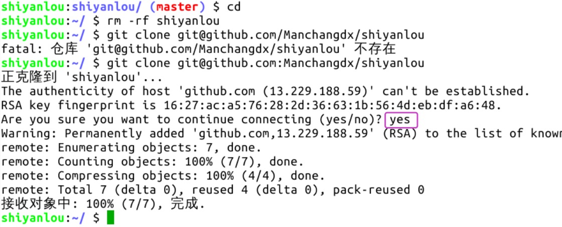 在实验环境里删除原仓库,使用此链接重新克隆仓库。克隆仓库是需要确认连接,输入 yes 即可: