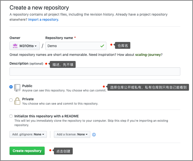然后给仓库命名(比如说 Demo),然后点击 Create Repository,无需考虑本页面的其他选项。
