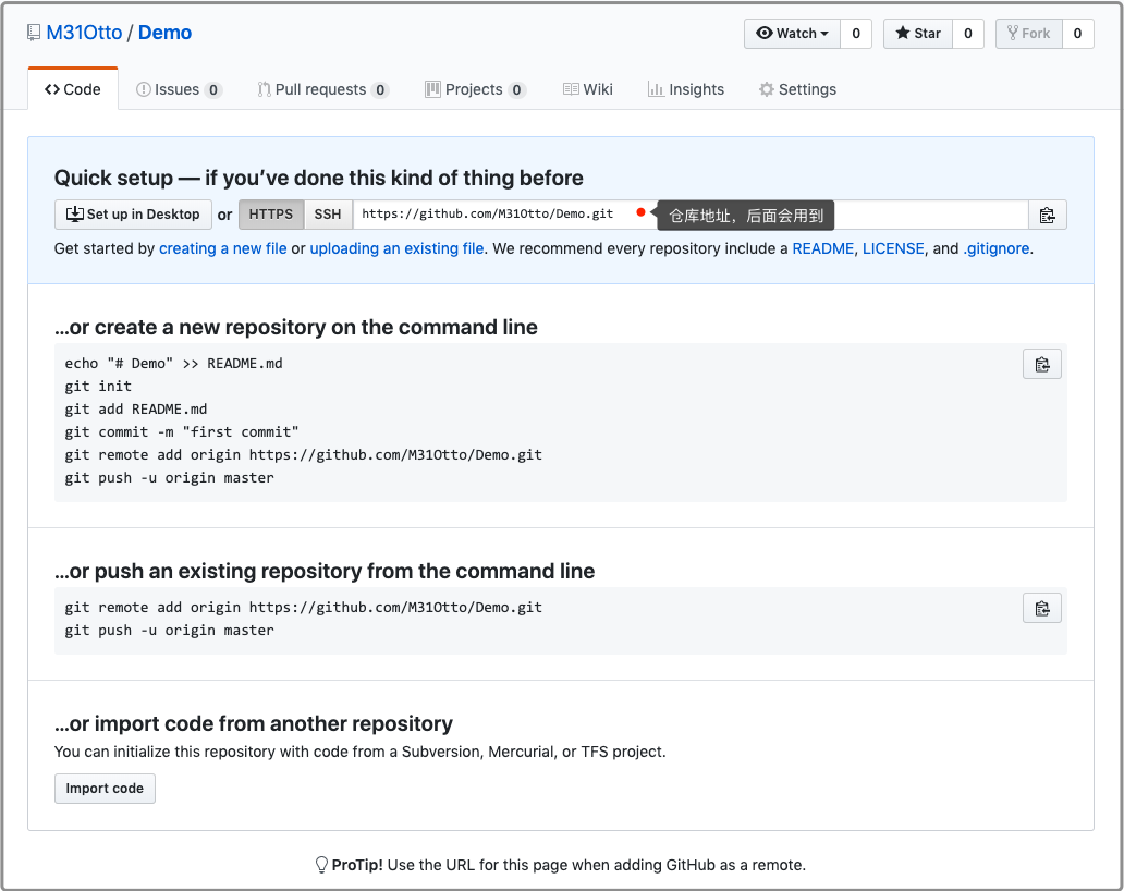 创建后,页面跳转到新建仓库的主页面,第一步成功了!