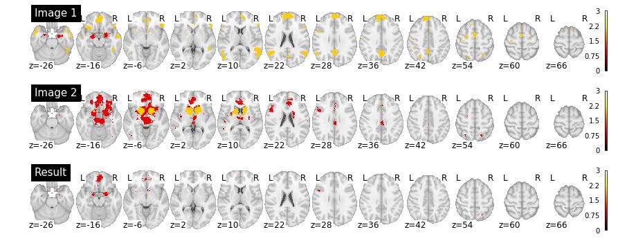 p = plot_stat_map(result, cut_coords=p.cut_coords, display_mode='z', title='Result', axes=axes[2], vmax=3)