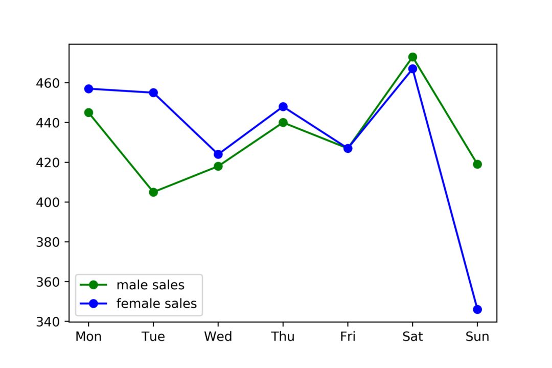 从这张图中可以看到在某个周日,男性用户购买了400多件产品,女性用户购买了350件产品。