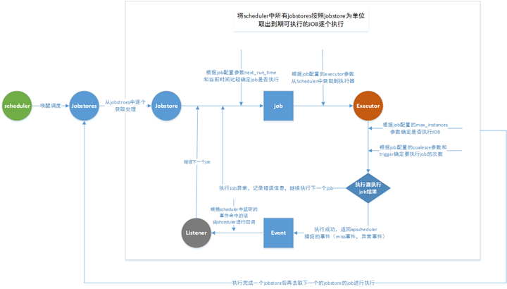 Scheduler 是 APScheduler 的核心,所有相关组件通过其定义。scheduler 启动之后,将开始按照配置的任务进行调度。除了依据所有定义 Job 的 trigger 生成的将要调度时间唤醒调度之外。当发生 Job 信息变更时也会触发调度。