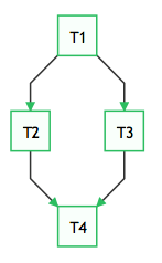 Airflow 使用 Python 开发,它通过 DAGs(Directed Acyclic Graph, 有向无环图)来表达一个工作流中所要执行的任务,以及任务之间的关系和依赖。比如,如下的工作流中,任务 T1 执行完成,T2 和 T3 才能开始执行,T2 和 T3 都执行完成,T4 才能开始执行。