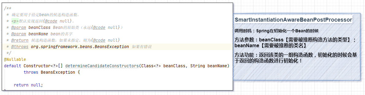 推断构造函数的回调就是通过SmartInstantiationAwareBeanPostProcessor#determineCandidateConstructors方法来做的!SmartInstantiationAwareBeanPostProcessor是BeanPostProcessor里面的一个子类,它对原有的接口进行增加,增加determineCandidateConstructors方法,再创建对象之前会回调这个方法,推断出未来创建对象的时候可能要需要的构造方法!事实上!这里也会进行注解@Lookup的解析,后面的学习也会说到,这里不重点说!