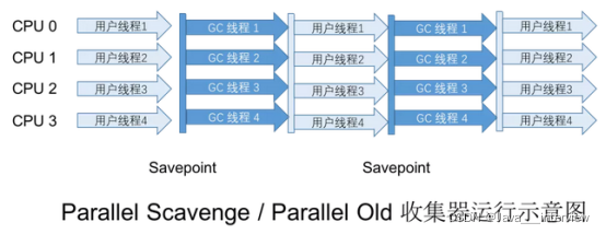 - 并行:Parallel,指多条垃圾收集线程并行工作,此时用户线程处于等待状态