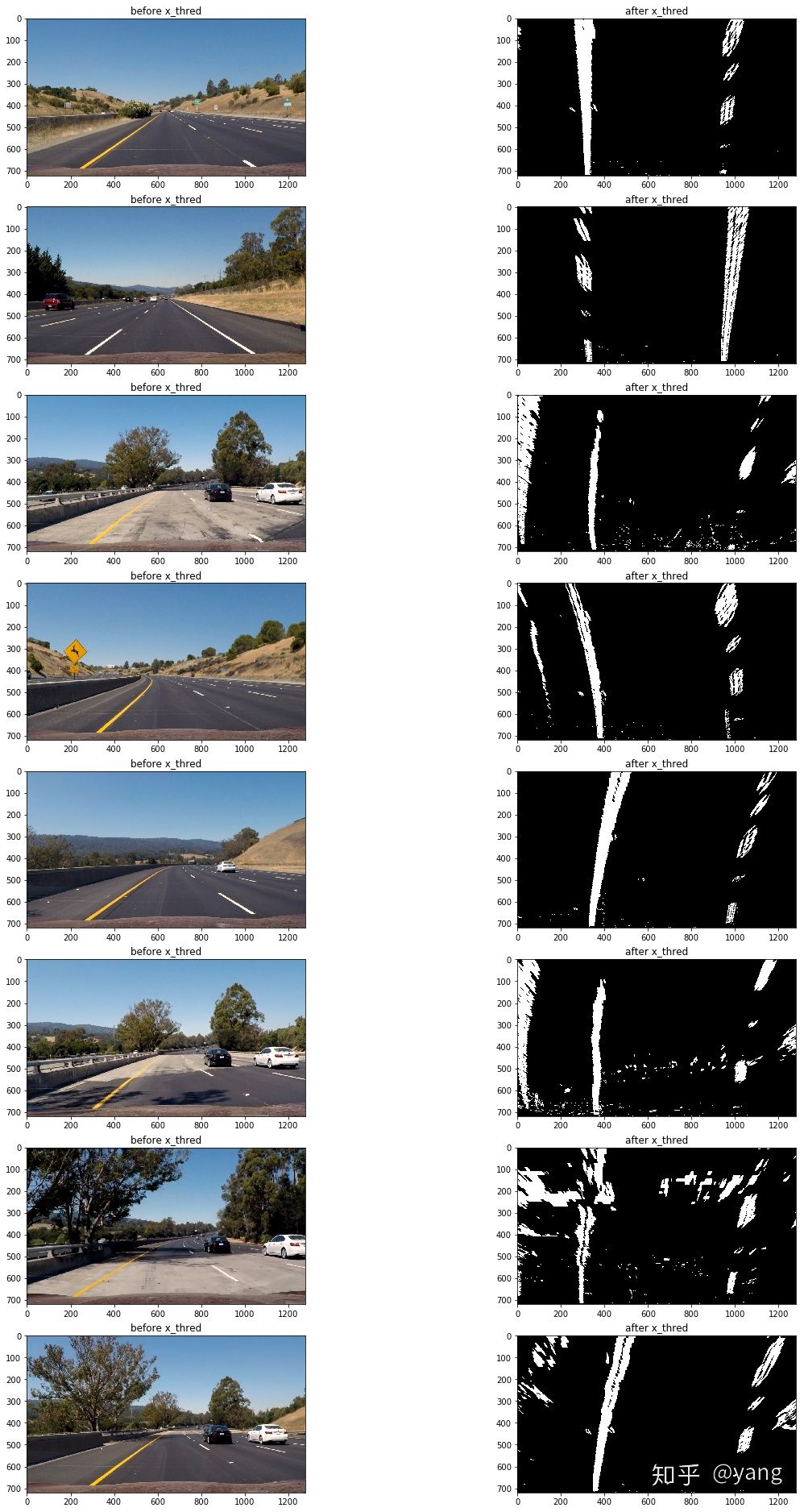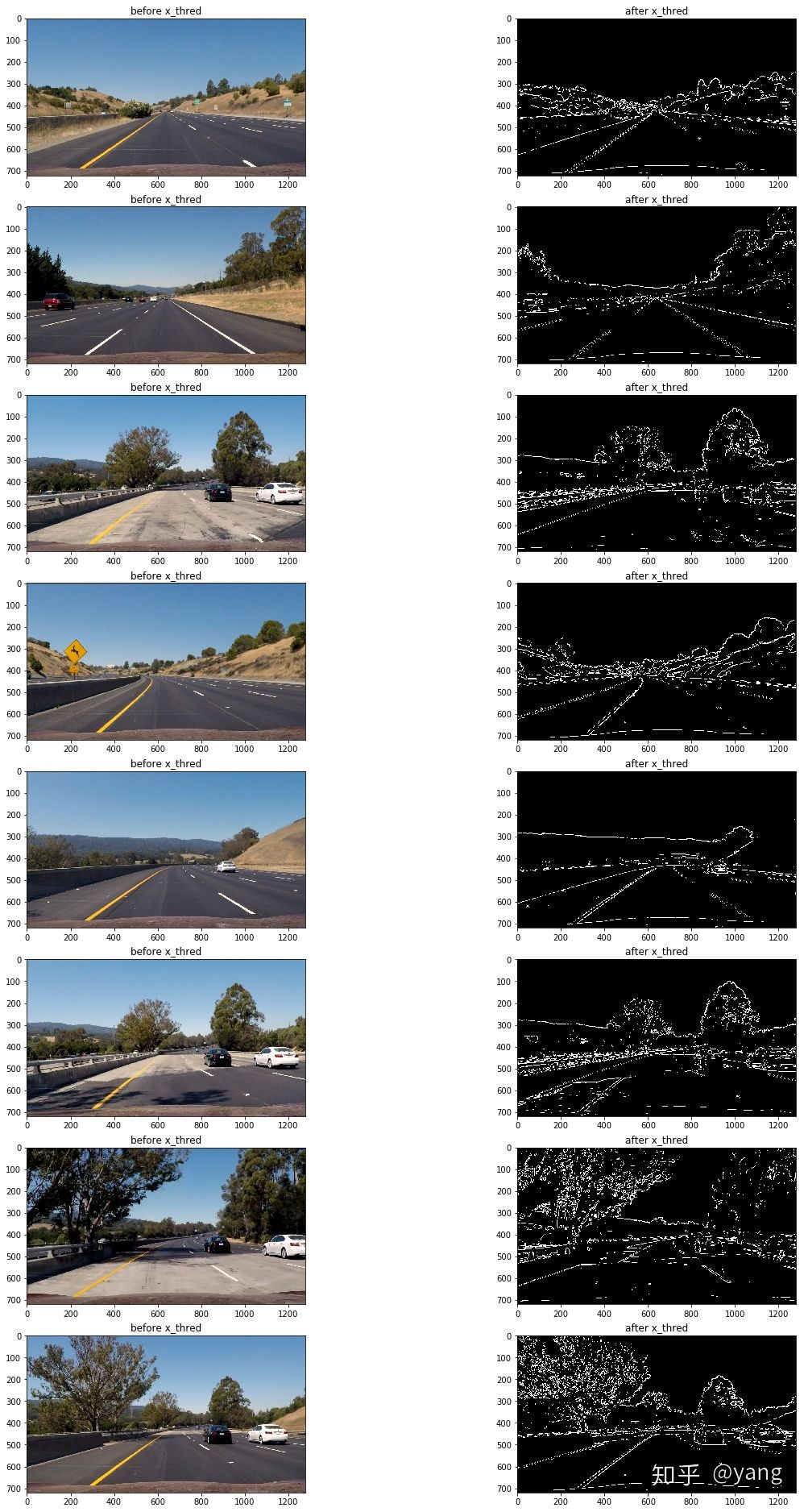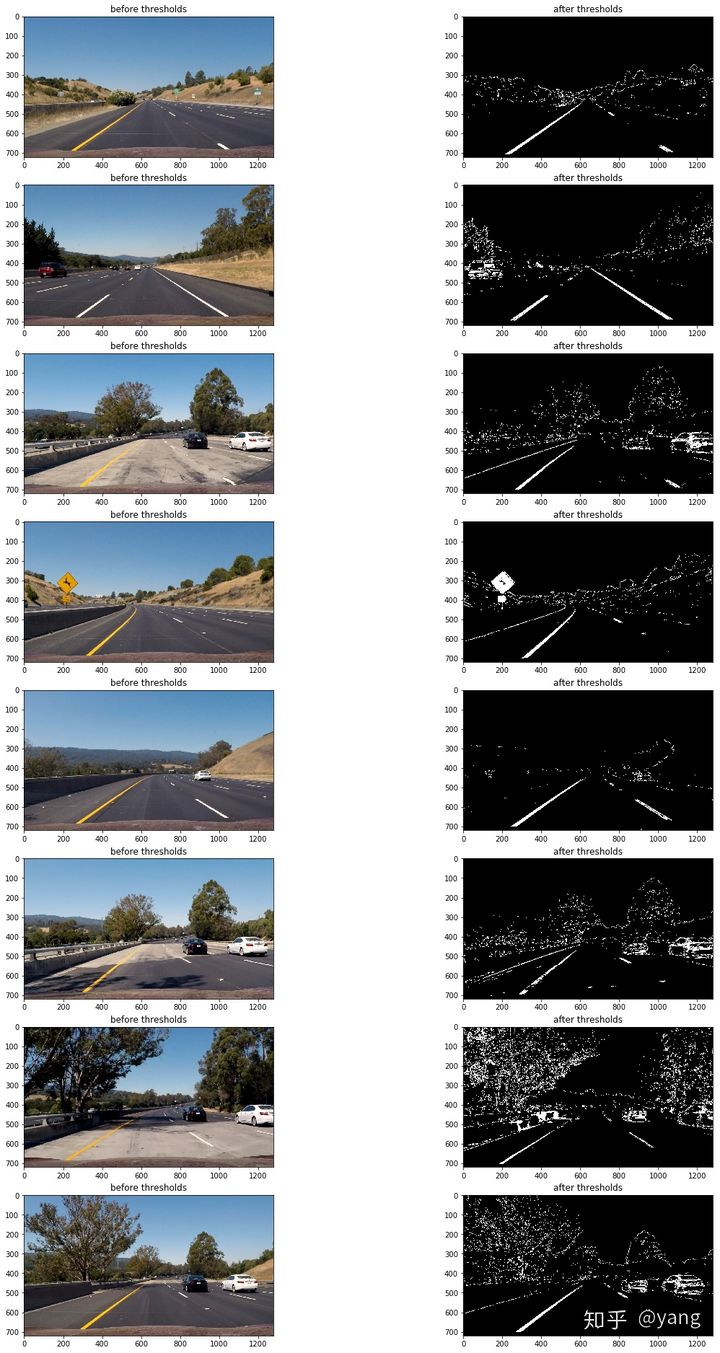 结果仍然不理想(观察第三,第六,第七张图片),原因是当路面颜色相对较浅且车道线颜色为黄色时,颜色变化梯度较小,想要把捕捉车道线需要把阈值下限调低,然而这样做同时还会捕获大量的噪音像素,效果会更差。