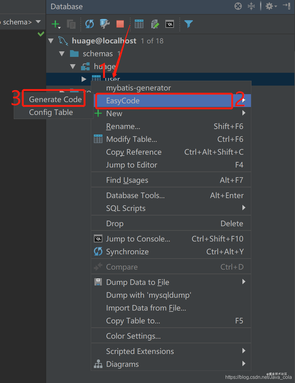 选择需要生成的表,这里可以选择多张表,然后右键选择EasyCode -> Generate Code。