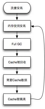 但是当流量高峰来临时,系统内存使用开始增多,触发了JVM进行full GC,进而导致大量缓存被释放(因为主流Java内存缓存都采用SoftReference和WeakReference所导致的),而大量请求又使得缓存被迅速填满,这就是反复缓存。反复缓存导致了频繁的full GC,而频繁full GC往往会导致系统性能急剧恶化。典型恶化流程图如下图: