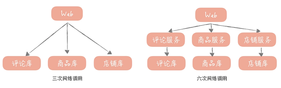 但是如果独立出商品服务、评论服务和店铺服务之后,那么就需要分别调用这三个服务,而这三个服务又会分别调用各自的数据库,这就是六次网络请求。如果你服务拆分得更细粒度,那么多出的网络调用就会越多,请求的延迟就会更长,而这就是你为了提升系统的扩展性在性能上所付出的代价。