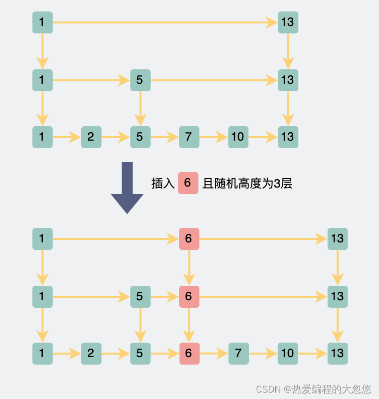 当我们需要往跳表中插入数据时,是通过随机函数产生当前节点的层数,然后更新每一层索引,往其中加入一个节点,如果当前层数不足,就新添加一个索引层。