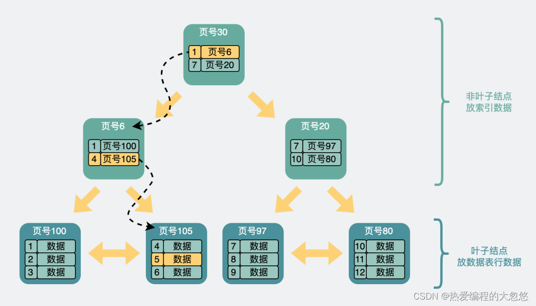 一般来说B+树是由多个页组成的多级层级结构,每个页16Kb,对于主键索引来说,叶子节点存放用户完整行数据,非叶子节点存放索引信息(索引列和页号)。每个数据页内部,通过页目录实现二分查找