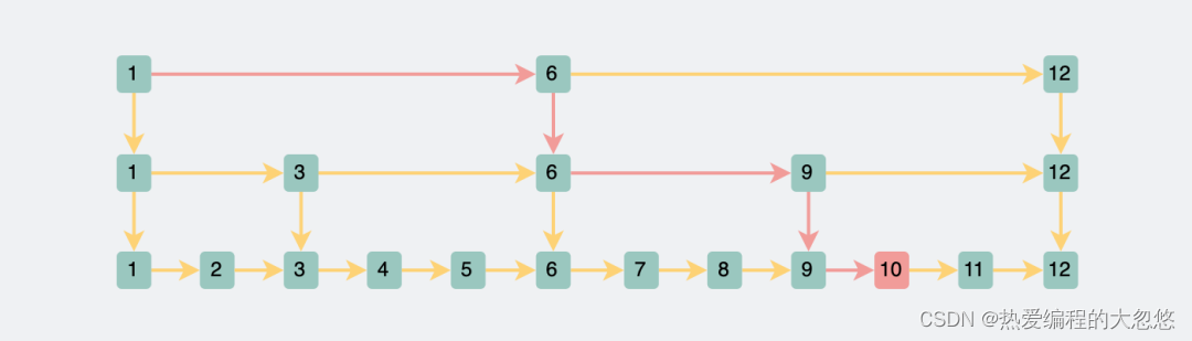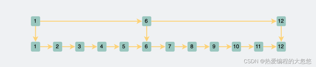 当数据量很大的情况下,一层索引查询复杂度无法满足O(logn)时,可以基于原始链表的第1层索引,抽出第二层/第三层更为稀疏的索引,结点数量是上一层的一半: