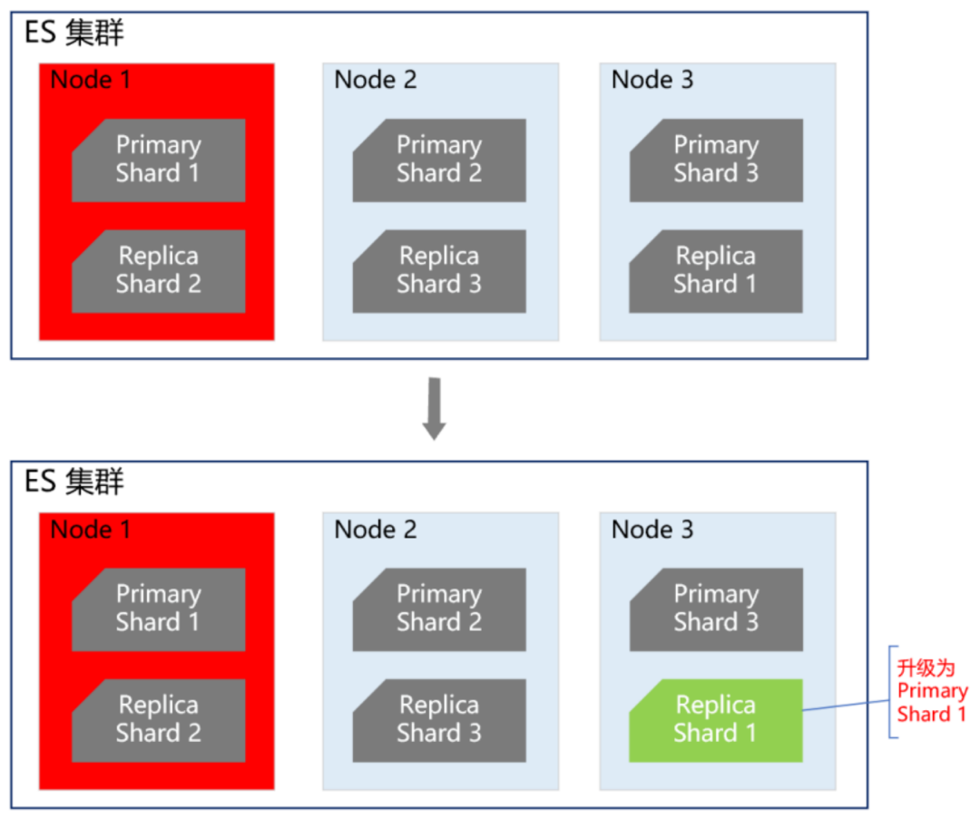 当 ES 集群有一个节点宕机了,会将其他节点对应的 Replica Shard 升级为 Primary Shard,继续提供服务。