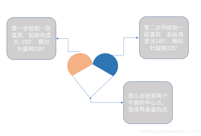 按这个理解,使用arcTo()方法,forceMoveTo参数值为true的时候,相当于直接将笔提起来,从另一个点开始绘制第二段弧,虽然这一段弧的起点与第一段弧有重叠的部分,但是,在计算机看来,这跟之前的弧形已经是不封闭的另一个图形了,因此,在接下来使用lineTo()方法将图形封闭的时候,封闭的只是第二段弧与中心点组成的图形,也就形成了我上面出现的不完整心形图案