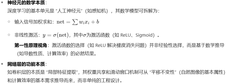 用第一性原理理解深度学习,本质是将其从 “工程经验驱动” 的黑箱转化为 “数学原理驱动” 的白箱 —— 从神经元的数学模型、优化理论的基本定理、任务的本质需求出发,层层推演,最终构建对模型工作机制的系统性认知。这一方法不仅能加深理解,更能为模型创新和问题解决提供底层逻辑支撑。