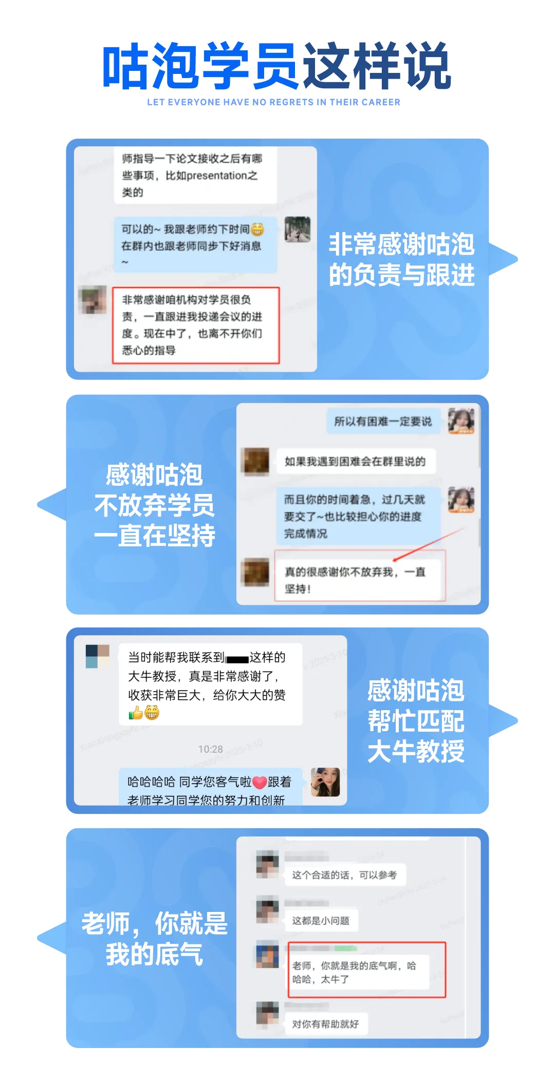 学员们覆盖机器学习、计算机视觉、自然语言处理等多个方向的成功案例,是咕泡服务质量的最好证明。这些背后,是学员从实验卡顿到文思流畅、从屡投屡拒到顺利录用的真实蜕变。