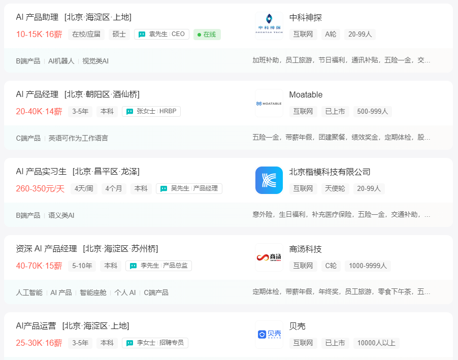 下面是在boss张搜索的AI产品经理岗位的招聘需求和薪资,可以明显看到市场对于AI+类型的人才的紧缺程度。