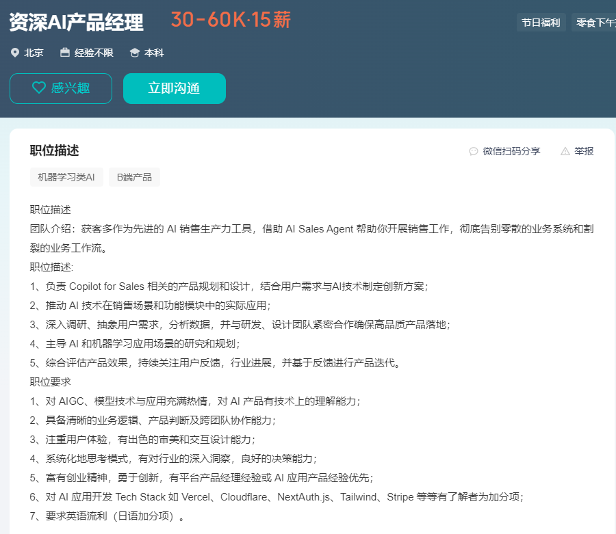 以下面这个岗位的需求为例, 这个公司需要做一个AI销售生产力工具,借助AI Sales Agent来开展销售工作,而这个产品必然和AI大模型是有紧密关联的,如果你不懂AI大模型,不知道AI大模型的能力边界,该如何适应这样的岗位呢?