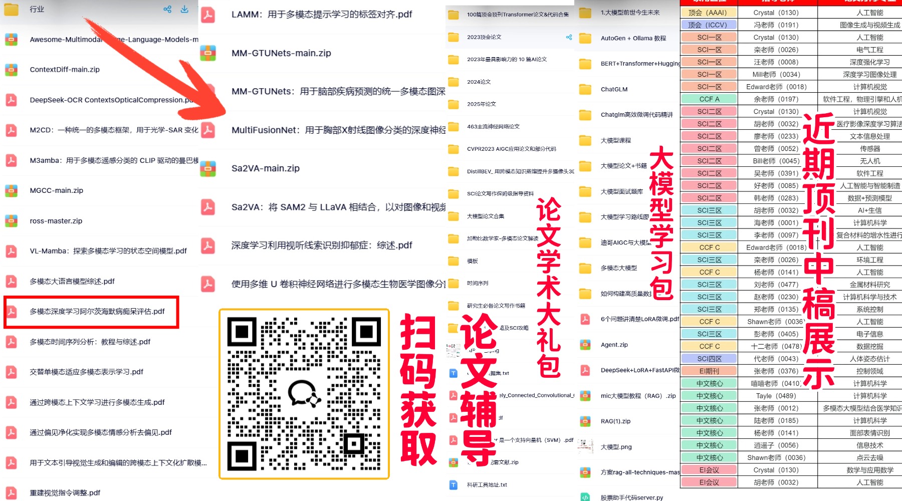 - 选对细分赛道:优先选择 “数据易获取 + 痛点明确” 的方向,如医疗影像融合(BraTS、CheXpert 数据集开源)、情感分析(CMU-MOSI、MELD 数据集)、低资源场景(少样本、缺失模态);
