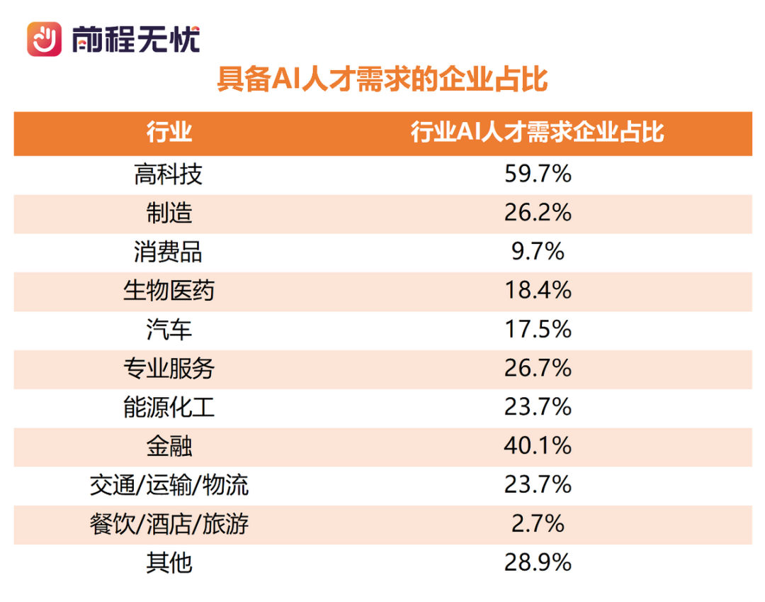 另一方面,各行各业都在增加对 AI 人才的需求,尤其以高科技行业赛道为主,在这份报告中显示,近 60% 的高科技企业已经将 AI 人才视为核心招聘指标,比老牌吃香的金融行业(40.1%)高了将近 20 个百分点,其他如专业服务、制造业、能源化工、交通/运输/物流 等都有 20% 以上的 AI 人才需求上涨。