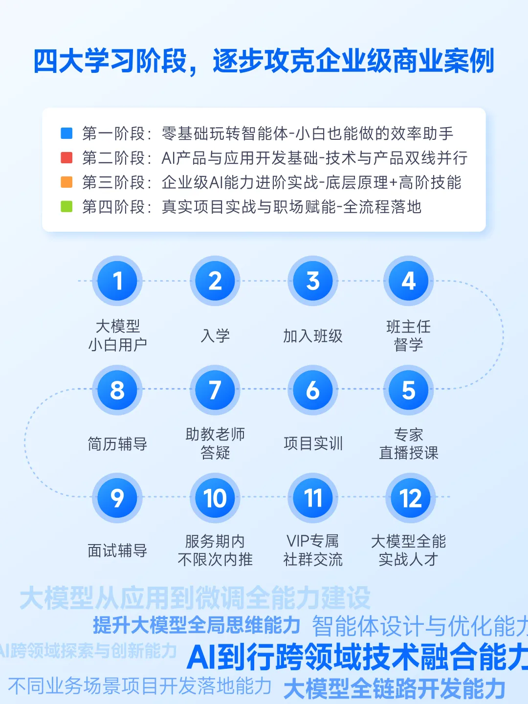 咕泡科技不仅关注趋势,更注重将前沿技术转化为实际解决方案。基于对大模型技术的深入理解开设《AI大模型零基础到商业实战全栈课》,助力企业与职场人快速适应AI变革: