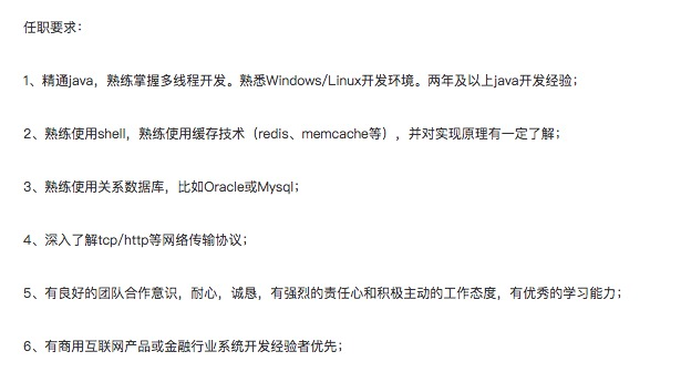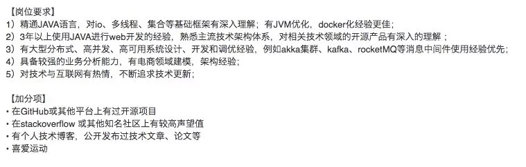 这个阶段的候选人一般都刚加入工作,工作时间不超过 3 年,对于这一部分候选人,公司的需求通常是解决一些基础的业务问题。他们会考察应聘者的基本功是否扎实、工作思路开阔。以下是一份典型的初级 Java 工程师的 JD:
